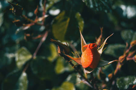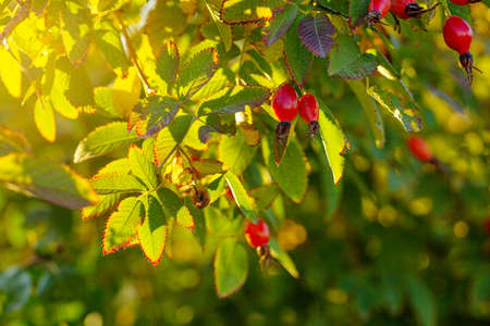 Rosehip bush at sunset, beautiful background.