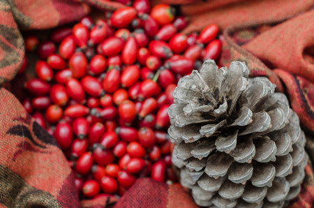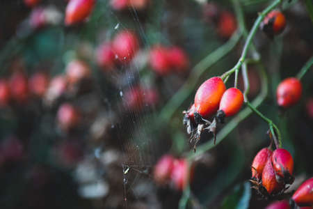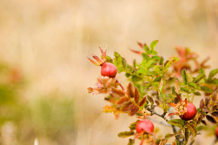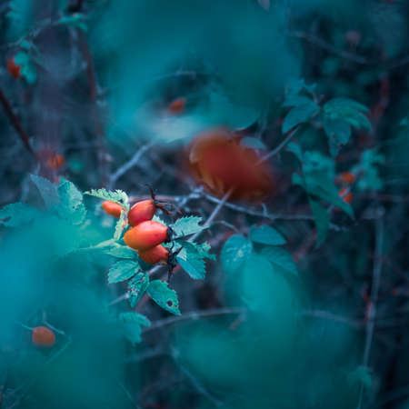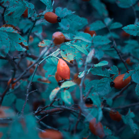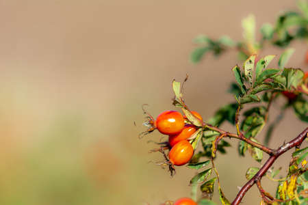 Briar, wild rose hip shrub in nature, autumn fall color tone