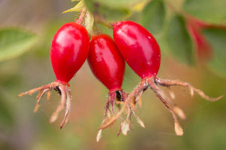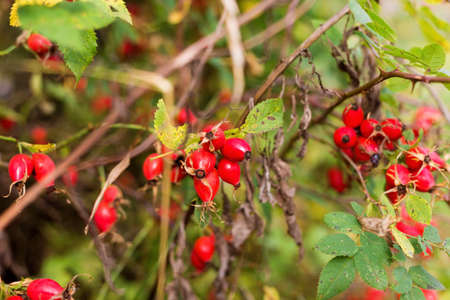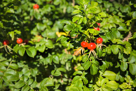 Rosehip - medicinal rose. Red rosehip berries in a vegetable garden
