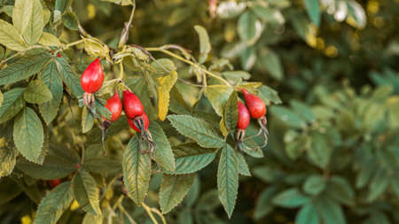 Close up wild rose hips bush in nature with bright wild rose or dog rose berries Red hips with leaves.