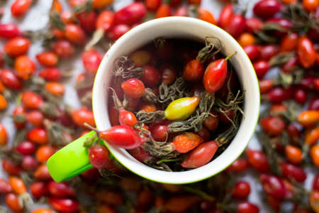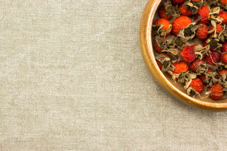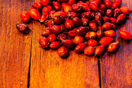 A bowl with dog rose (Rosa Canina) red hips on a rustic wooden table, top view