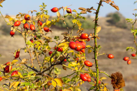Branches of ripe rose briar hips in autumn. Countryside scene of harvesting