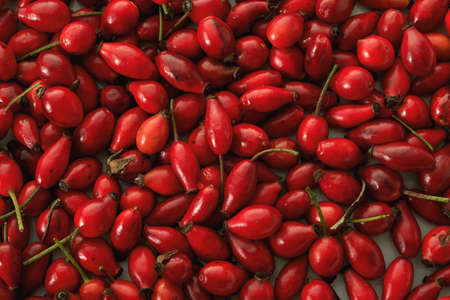 Detail macro view of dog rose hips (latin name Fructus cynosbati) prepared for drying. Dried rose hips are important source of vitamins in alternative medicine. Typical fall berry fruit.