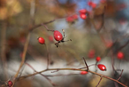 Rose hips on a bush branches, soft focus in strong autumn sun back light.