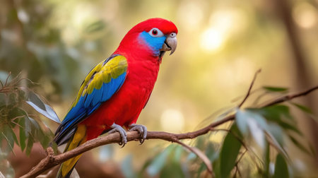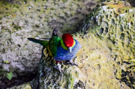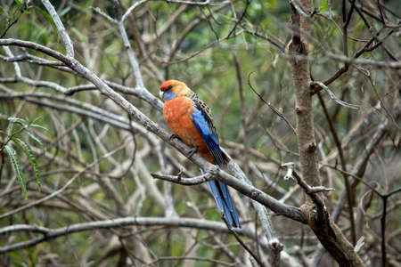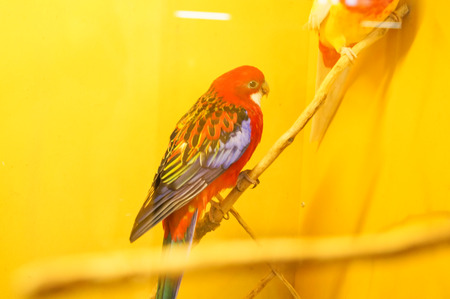 A bright red and yellow eastern rosella (Platycercus eximius) parrot or parakeet is a rosella native to southeast of the Australian continent and to Tasmania.