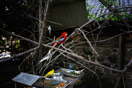 Brightly colored parrots on branches surrounded by food dishes in an aviary