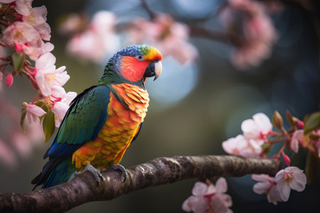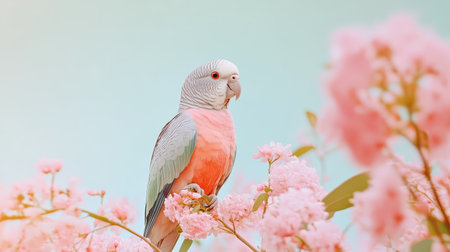 A vibrant parrot with shades of pink and blue sits on blooming pink flowers in a serene setting during daytime.