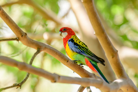 Eastern rosella (Platycercus eximius) parrot colorful small bird, animal sitting on a tree branch in a city park.