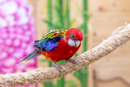 Large pink rosella Platycercus elegans parrot sitting on a rope in a pet shope window, close-up.