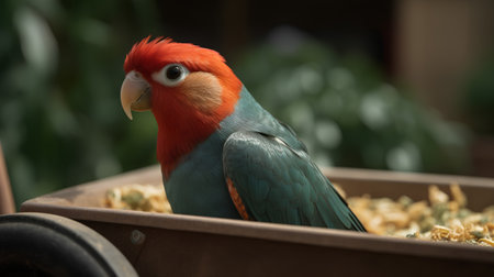 A vibrant parrot with red, green, and yellow plumage is perched near a window. The bird is the focal point, set against a blurred green backdrop suggesting an outdoor environment. This image showcases rich colors and textures, suitable for various uses including editorial and commercial projects.