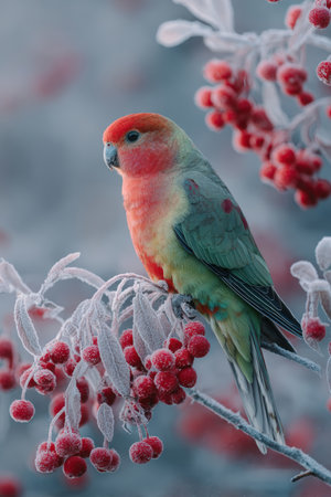 Vibrant Parrot on Frosted Branch with Red Berries in Snowy Scene