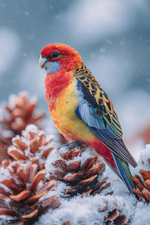Vibrant Parrot Perched on Snowy Pinecones in Winter Wonderland