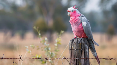 A pink and gray bird known as a Galah is sitting on top of a weathered wooden post. The bird is in a relaxed position, observing its surroundings with curiosity.