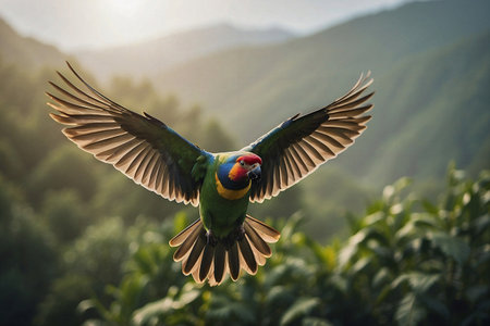 An AI generated illustration of A vibrant parrot soaring through a sunny sky above a lush landscape with trees and shrubbery