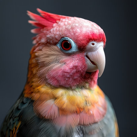This striking close-up portrait showcases a vibrant scarlet parrot against a dark background, highlighting its bright colors and intricate feather textures.
