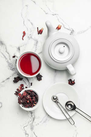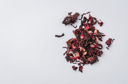 red hibiscus tea, flower and dry blossom isolated on white background. Top view