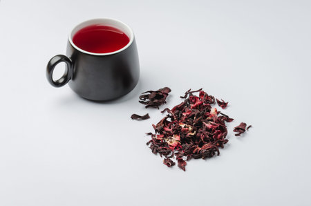 red tea Hibiscus in a black mug on a white background