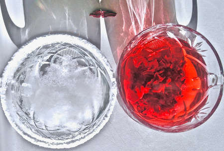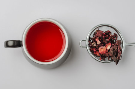 Cup of hibiscus tea (karkade, red sorrel, Agua de flor de Jamaica) on a table. Drink made from magenta calyces (sepals) of roselle flowers.