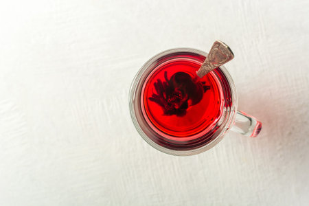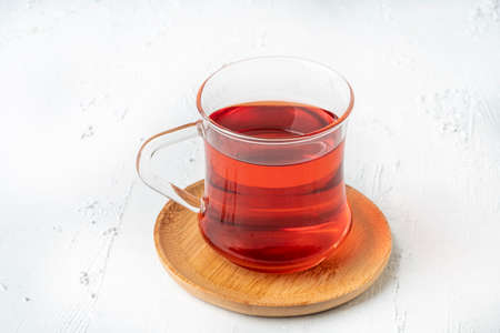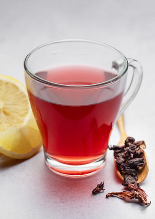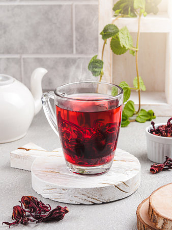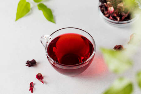 Hot hibiscus tea in a glass cup on light background
