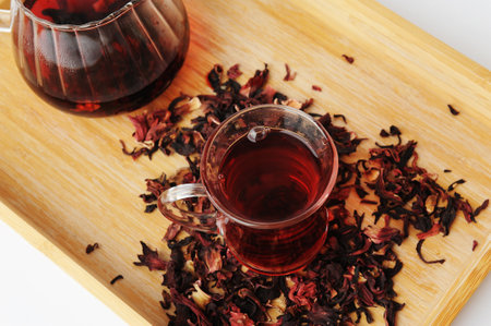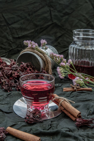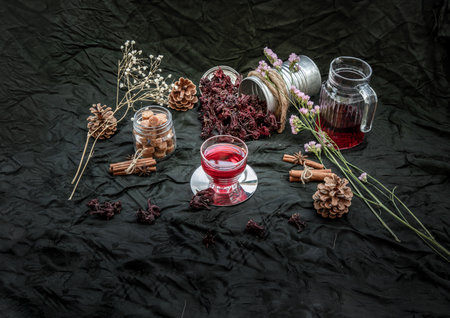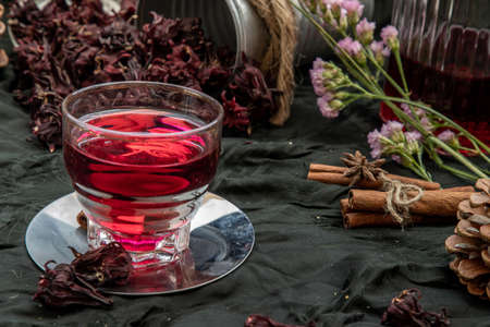 Roselle tea (Jamaica sorrel, Rozelle or hibiscus sabdariffa ) with dry roselle and brown cane sugar cube. Healthy herbal tea rich in vitamin C and minerals. The concept of health. Organic and Summer drink, Drinks & Beverages, Selective Focus.