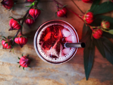 Iced roselle tea glass with fresh roselle fruit in top view on wooden table for healthy herbal drink concept.