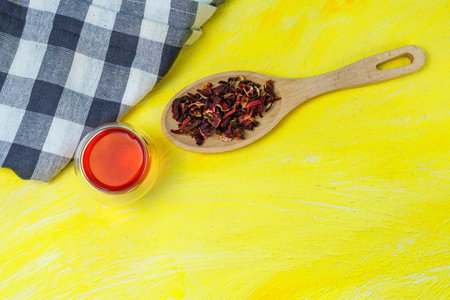 Egyptian red tea karkade in a glass cup on wooden background