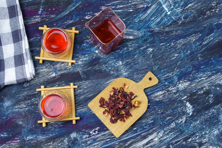 Hot red karkade tea in a glasses on rustic background