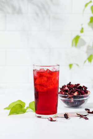 Cold refreshing hibiscus tea in a glass with ice, dry tea leaves of red herbal tea with lime in the background and fresh aromatic mint
