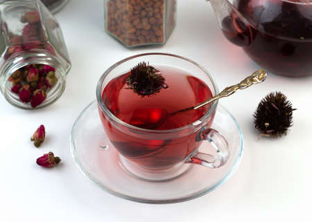 red flower tea from red rose petals, delicious red tea from rose buds on the table