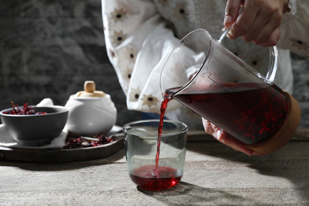 Woman pouring freshly brewed hibiscus tea from teapot into glass at wooden table, closeup