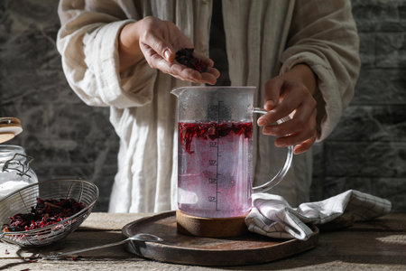 tea ceremony. a woman's hand pours fragrant red hibiscus tea into a cup of mint leaves. top view of the wooden tray with morning tea