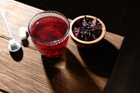 Delicious hibiscus tea in glass, sugar cubes and dry roselle petals on wooden table