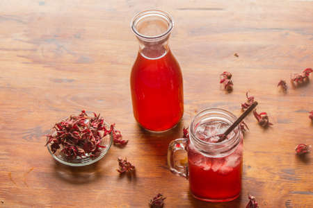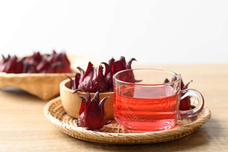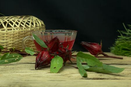 Roselle tea on wooden background, Healthy herbal drink