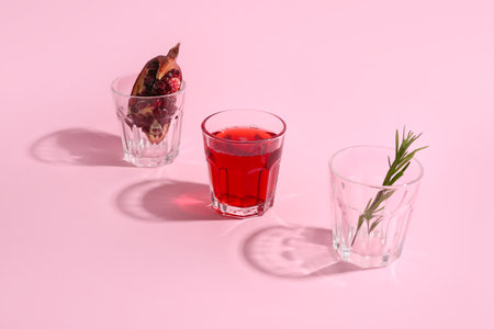 Glasses of fresh pomegranate juice and rosemary on pink background