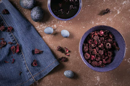 Dry hibiscus tea in a bowl. Dried hibiscus calyces, herbal tea made of crimson and deep magenta-colored sepals of the roselle flower, in the bowl on the table, top view.