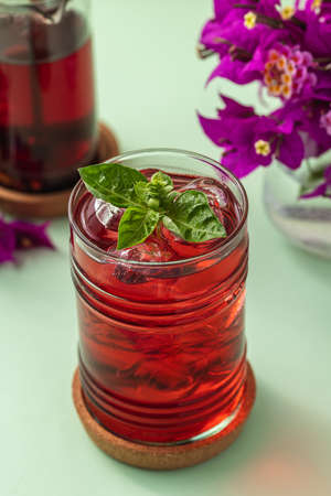 Freshly brewed iced red fruit tea on green table