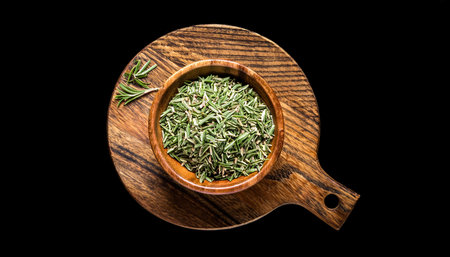 rosemary in wooden bowl on a wooden cutting board, isolated against a wooden background