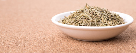 Dried rosemary herb leaves in white bowl over cork board background
