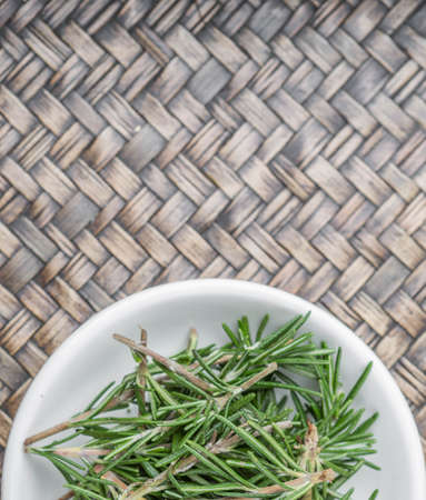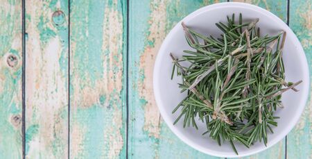 Fresh rosemary herbs over in white bowl over wooden background