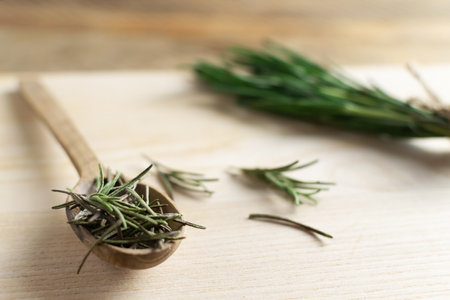 A spoon with dry rosemary and a bunch of fresh twigs lies on a wooden table. Rustic style. Ingredient for the bouquet Garni, Provencal herbs and Italian herbs. Copy space. Selective focus.