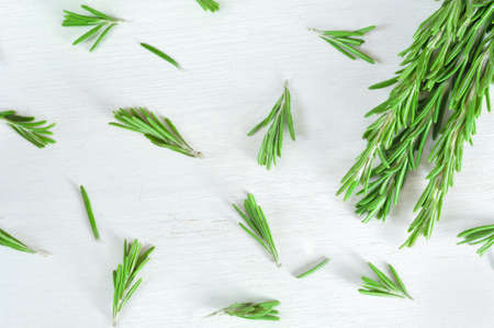 Fresh rosemary twigs on white wooden background