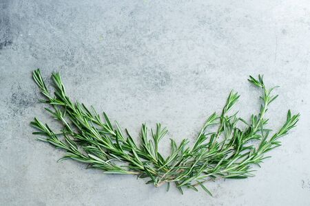 Flatlay with rosemary sprigs arranged on metallic background with text space