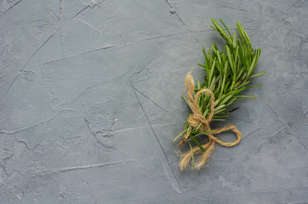 A bunch of fresh green twigs of rosemary wrapped in paper and tied with a rope lies on a blue background. Seasonings. Copy space.