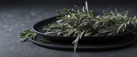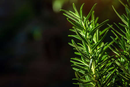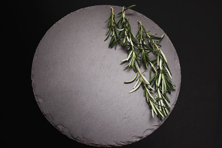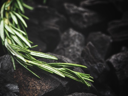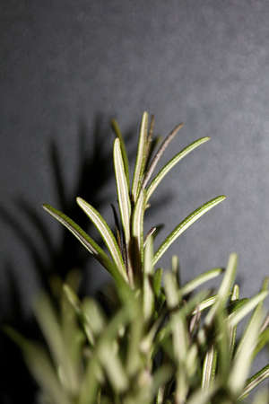 Fresh rosemary twig on a dark background with copy space.