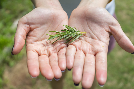 female hand holding fresh rosemary plant for cooking