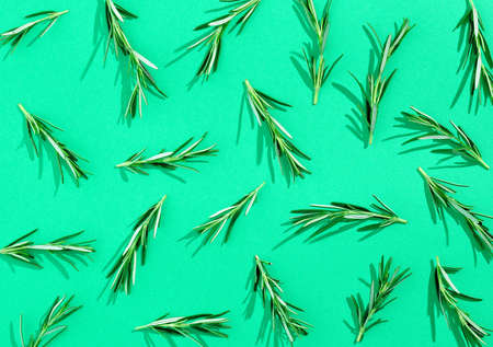 Colorful rosemary pattern on green background, from above, hard shadow