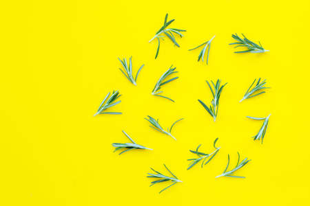 Rosemary on yellow background. Top view with copy space