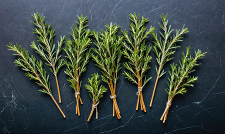 Fresh rosemary sprigs are arranged on a dark countertop