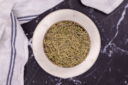 Dried herbs rosemary leaf. Dry seasoning rosemary on dark background. Spices and herbs for cooking, provence herbs. Top view