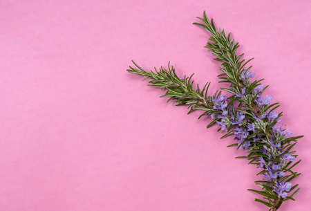 Close up of a beautifully blooming rosemary, several stems. Draped on a pink background